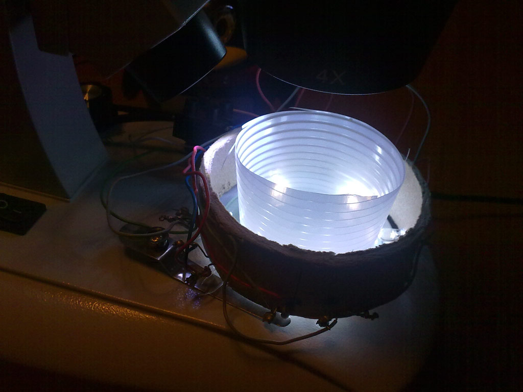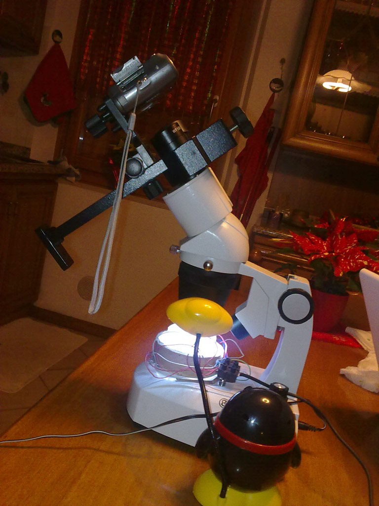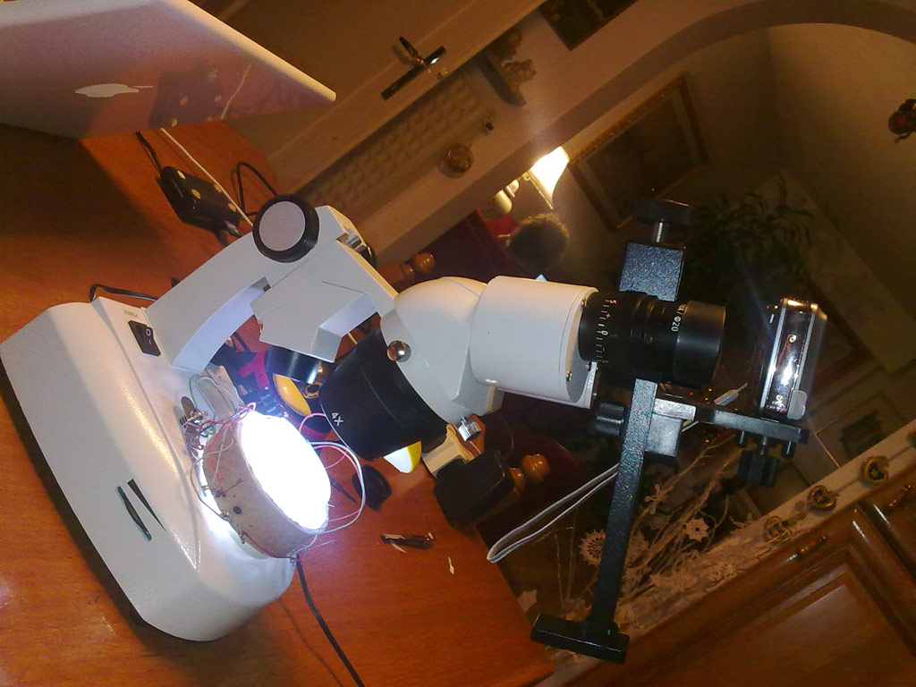 Essendo il mio stereoscopio con oculari di diametro non di misura standard, ho trovato in commercio questo trabiccolo che si aggancia al tubo porta oculare e alla macchina fotografica e permette di centrare l'illuminazione. Su eBay c'è a vari prezzi, io ne ho comprato fino ad ora 3 e vi consiglio di prendere quello un po' più caro (60$) perché e' più robusto e dunque più stabile.