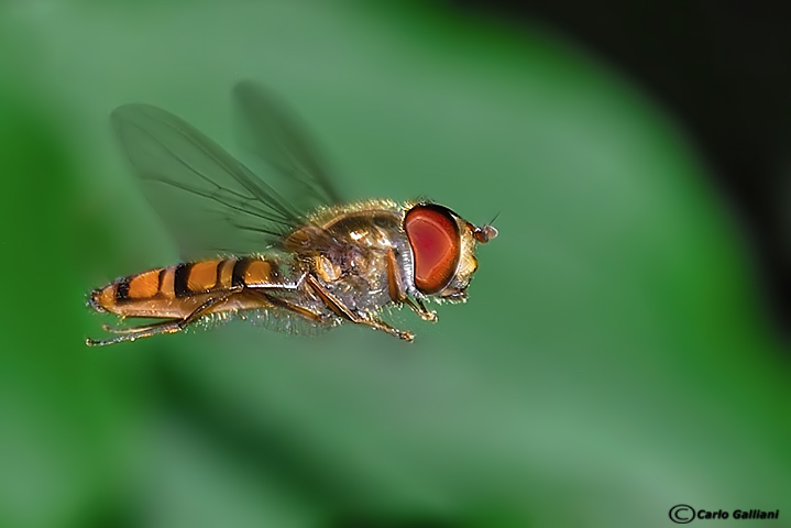 episyrphus balteatus : i sirfidi sono forse gli insetti più facili da fotografare in volo visto il loro volo in standby anche se essendo così piccoli creano sempre problemi, evidente l'uso del flash