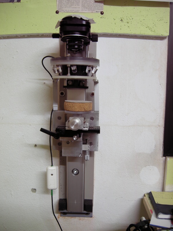 Sto costruendo quello che ho definito "" banco da macro "". Dico sto costruendo perche' ci sono sempre migliorie e modifiche in corso.... come base di partenza ho usato un tornio da orologiaio, debitamente pulito da tutte le parti inutili, devo dire che in quanto a stabilita e precisione non e' male. Ho aggiunto il solito motore passo passo e dopo svariate notti insonni sono riuscito ad applicare un software di pilotaggio diciamo decente. Ho iniziato quindi a fare i primi esperimenti pratici, e sono sorti i primi problemi.... data la configurazione orizzontale non ho nessun problema con soggetti ad ingrandimento spinto e/o particolari di essi. Quando invece ho a che fare con soggetti cartellinati, il dover porre il soggetto su un piano a novanta gradi rispetto all'asse sensore ottica soggetto mi crea problemi. Curiosando nel sito e per la rete ho trovato molte immagini che riguardano queste situazioni ( quelle in cui si vede anche l'attrezzatura di ripresa) in quasi tutte per non dire tutte, le riprese a soggetti cartellinati sono fatte con stativi (seppur di varia foggia) verticali, quelle molto spinte (di ingrandimenti) con stativi orizzontali.
