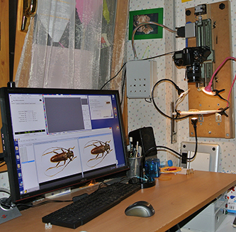 Posiziono l'insetto in modo che non sia inclinato rispetto al sensore, ruotando a mano il tappo (avevo pensato di aggiungere un piano rotante, ma non ne vale la pena), poi lo centro usando le manopole del piano del microscopio, faccio una prima messa a fuoco con la slitta maggiore, poi metto a fuoco il dorso con la micrometrica e inizio la sequenza di scatti.