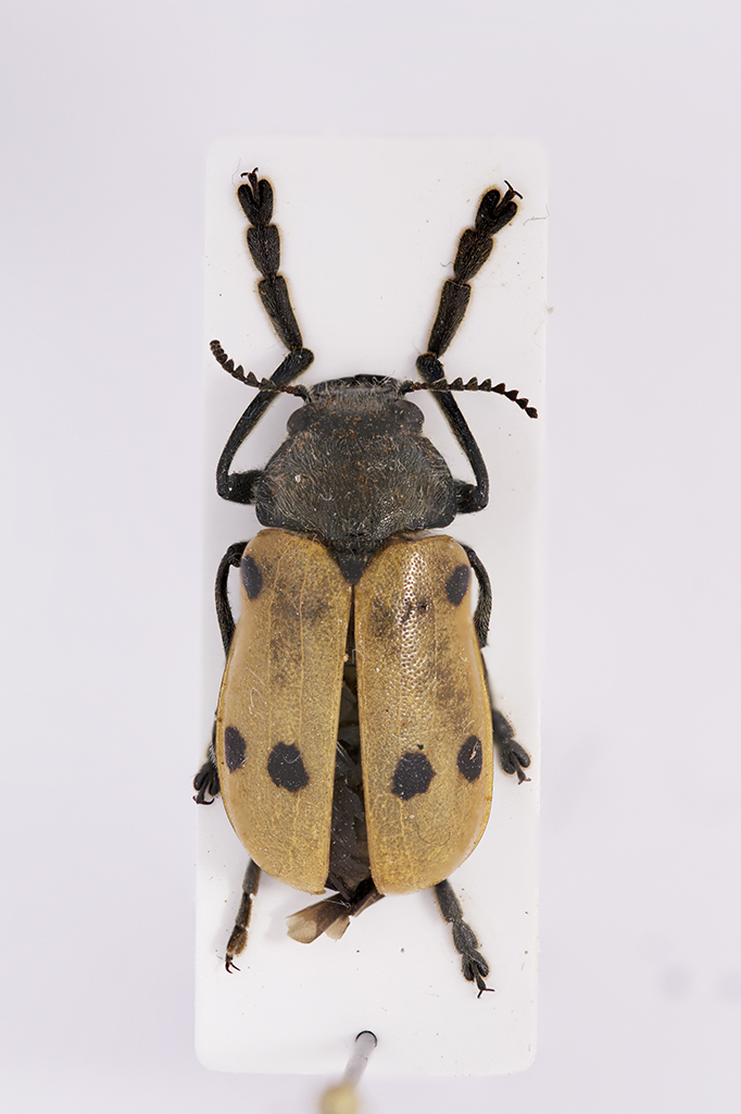 Ultimo passo: al flash ho montato un diffusore portatile di 20x15cm circa, messo il flash in alto a 45 gradi dal terreno e 45 gradi dall'asse del cavalletto e un foglio di cartoncino leggermente sagomato dalla parte opposta rispetto al flash per filettere la luce che viene dal flash. Poi ho posizionato un foglio di cartoncino per metà in piano e per metà formante una curva dolce fino ad arrivare perpendicolare alla base d'appoggio con il pezzo di plastozote con l'insetto sulla parte piana, in modo da simulare un set da still life. Attorno all'insetto un bicchierino di plastica con due fori ai lati. Ecco il risultato, a mio parere molto soddisfacente. Più tardi metterò anche la variante in cui la luce flash arriva non di lato al soggetto ma di fronte, un po' meglio perchè non c'è il riflesso asimmetrico sull'elitra.