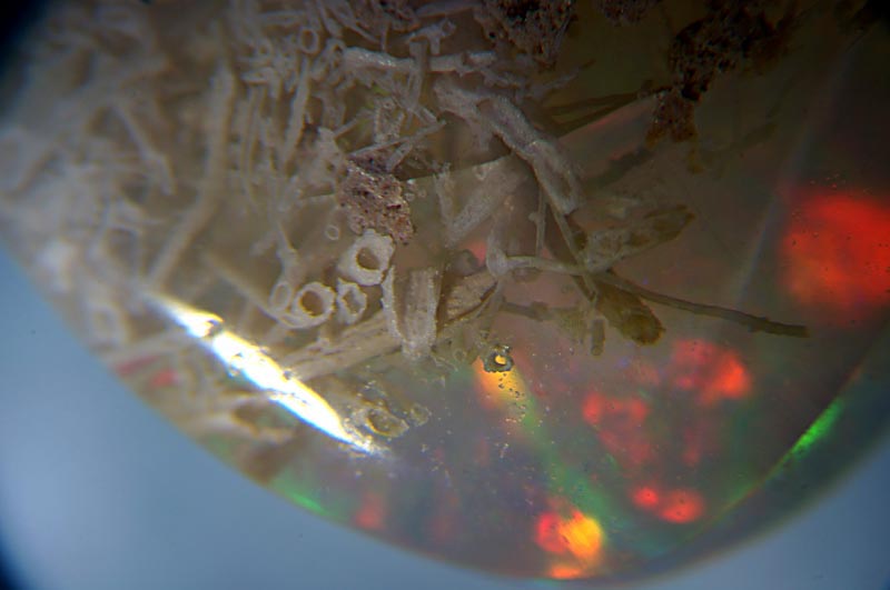 Anche qui il rutilo è spesso presente con i suoi filamenti, così come spesso si ritrovano residui di piante fossilizzate dentro all’opale.