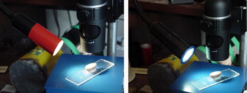 Per i miei usi un grosso vantaggio di queste lampade è la forma regolare del porta led: perfettamente tubolare. Questo mi permette di montare qualsiasi filtro, mi basta fare un cilindretto di cartoncino e Vinavil per fissare filtri di conversione colore, polarizzanti, regolatori continui di luminosità, ecc.