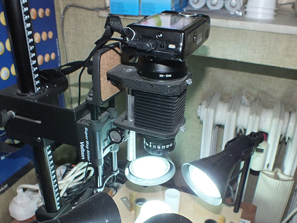 Sono passati quattro anni, ed alla fine ho dovuto provare una di queste famose mirrorless! Come avevo anticipato qui, approfittando del fatto che i modelli della penultima generazione si trovano usati a prezzi modestissimi, ho preso una Samsung NX100 di 3 o 4 anni, ma in condizioni praticamente perfette, al costo di 75 Euro (solo corpo, ma poi me ne sono pentito, perchè con 40-50 Euro in più avrei potuto prenderne una con l'obiettivo standard 20-50, che da solo vendono usato a prezzi molto più alti, e che pare sia di buona qualità). Confesso che non ero molto convinto. Samsung non mi dava molta fiducia come produttrice di fotocamere di buona qualità. Però mi sono dovuto ricredere. Già quando mi è arrivata ho notato che si tratta di una macchina piuttosto semplice, con relativamente poche funzioni , ma organizzate bene, abbastanza piccola rispetto ad una reflex, ma molto solida. Purtroppo ho dovuto aspettare alcune settimane per provarla, poichè l'adattatore per montarla sul soffietto a vite, comprato anch'esso in Inghilterra, mi è arrivato solo oggi, dopo ben 24 giorni (le poste italiane ad agosto non sono una meraviglia). Nel frattempo ho avuto il tempo di aggiornare il firmware della macchina, necessario per poter scattare con obiettivi non dedicati (ovvero del tipo NX). Oggi ho finalmente potuto provarla. Ho fatto solo qualche scatto "normale" con un vecchio 50 mm con attacco a vite, con cui vengono foto più che accettabili, anche grazie al sensore, delle stesse dimensioni di quello delle reflex Nikon (escluse quelle full frame di fascia alta), ma con un numero di pixel non eccessivo (14,6 MP, mentre i modelli successivi ne hanno 20,3), giusto compromesso, secondo me, tra numero e dimensioni dei pixel. Poco fa l'ho montata su un soffietto a vite, utilizzando l'apposito adattatore. La mancanza del mirino non crea problemi, perchè l'immagine sul display è ben visibile (nel mio caso, con gli occhiali). Bisogna perdere un po' di tempo per trovare il miglior bilanciamento del bianco, ma basta impostarlo la prima volta. Lo scatto è piuttosto silenzioso e induce molte meno vibrazioni di quello della mia Canon 550D, anche in live view. Visto che accetta lo scatto a distanza della Canon, non ho avuto neanche bisogno di comprarne un altro (è sempre meglio evitare di scattare premendo il pulsante sulla macchina). La messa a fuoco è abbastanza facile, mentre devo ancora regolare bene il tempo di scatto per ottenere foco con la luminosità adatta. Ma basta fare qualche prova. Come prima prova ho fotografato una Chrysodema molto lucida, piuttosto difficile da illuminare nel modo giusto. La foto finale, dopo lo stacking, risente di una sottoesposizione, che ho compensato poi con PSP, e di una luce un po' troppo diffusa, ma nel complesso direi che i risultati sono perfettamente paragonabili a quelli della mia Canon 550D. Con un po' di pratica, dovrebbe rivelarsi una buona macchina per queste macro a materiale preparato. Molto interessante il fatto che lo scatto produca vibrazioni molto deboli.