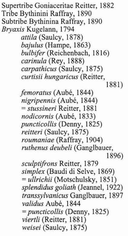 Bryaxis Kugelann, 1794 attila (Saulcy, 1878) bajulus (Hampe, 1863) bulbifer (Reichenbach, 1816) carinula (Rey, 1888) carpathicus (Saulcy, 1875) curtisii hungaricus (Reitter,1881) femoratus (AubC, 1844) nigripennis (Aubt, 1844) = stussineri Reitter, 1881 nodicornis (AubC, 1833) puncticollis (Denny, 1825) reitteri (Saulcy, 1875) roumaniae (Raffray, 1904) ruthenus deubeli (Ganglbauer,1896) sculptifrons Reitter, 1879 simplex (Baudi di Selve, 1869) = ullrichii (Motschulsky, 1851) splendidus goliath (Jeannel, 1922) transsylvanicus Ganglbauer, 1897 validus AubC, 1844 = puncticollis (Denny, 1825) viertli (Reitter, 188 1) weisei (Saulcy, 1875)