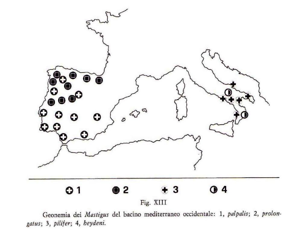 La cartina rende pefettamente la "strana" distribuzione delle due specie (pilifer ed heydeni).