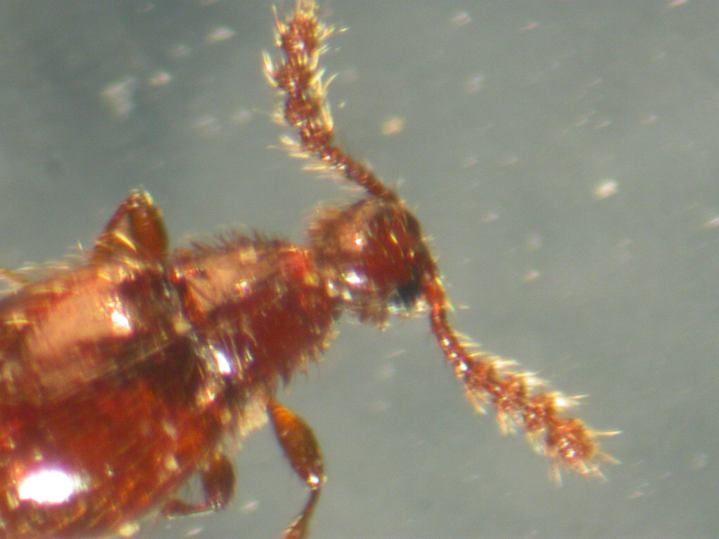 Questa bella bestiola, lunga poco più di 1 mm, è uscita fuori da un formicaio situato in un tronco morto di quercia da sughero. Ovviamente ho preso anche alcuni esemplari della formica in questione. Mi ha subito colpito l'aspetto generale 'setoloso', soprattutto sul capo, e la conformazione delle antenne: Euconnus sp.?