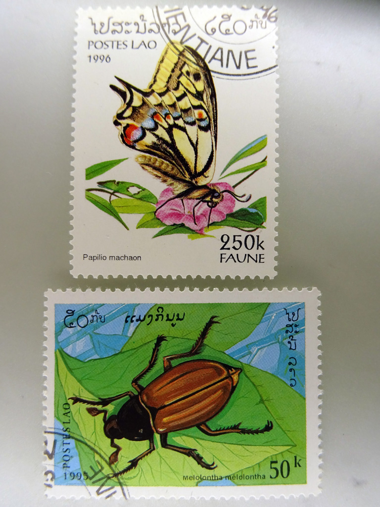 Laos: Papilio machaon, Melolontha melolontha (sulla specie c'e' l' accento sulla E) Laos: Lucanus cervus, Xylocopa violacea