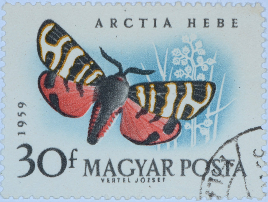 Ancora un francobollo ungherese della serie del 1959: raffigura un'Arctia festiva (Hufnagel, 1766), anche se è chiamata Arctia hebe, nome in sinonimia con A. festiva.