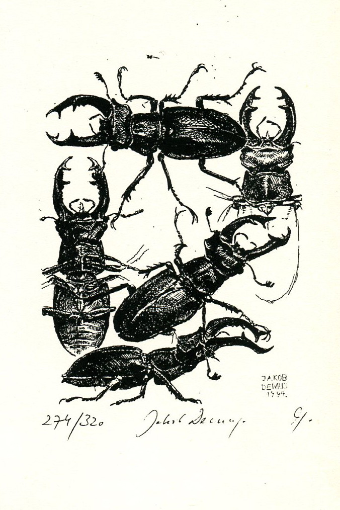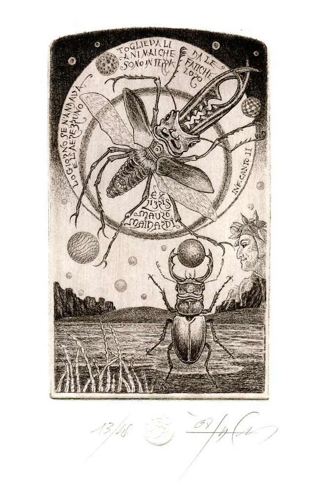 Nomas ha scritto: Da tempo colleziono ex libris eseguiti da validi artisti incisori, anche a soggetto entomologico. In particolare sto raccogliendo l’iconografia concernente il cervo volante negli ex libris, con l’intenzione di scrivere un articolo al proposito in collaborazione con l’amica Eva Sprecher-Uebersax del Museo di Basilea. Negli ex libris il cervo volante è talvolta rappresentato come simbolo del bene o del male. In diversi ex libris il lucanide è illustrato nella posa di reggere il mondo tra le mandibole, forse per rappresentare la sua forza ma non sono convinto di questa interpretazione. C’è qualcuno che può illuminarmi in merito a questa simbologia?