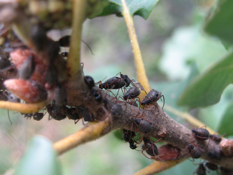 Su un giovane ramo di Quercus pubescens il 9 Novembre 2006 c'era un gran daffare per depositare ordinatamente le uova (tranne due fuori posto), accoppiarsi e ciucciare la melata da parte delle formiche.
