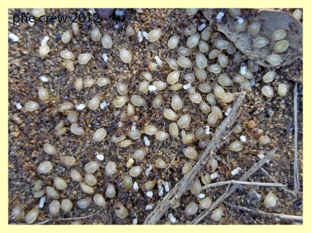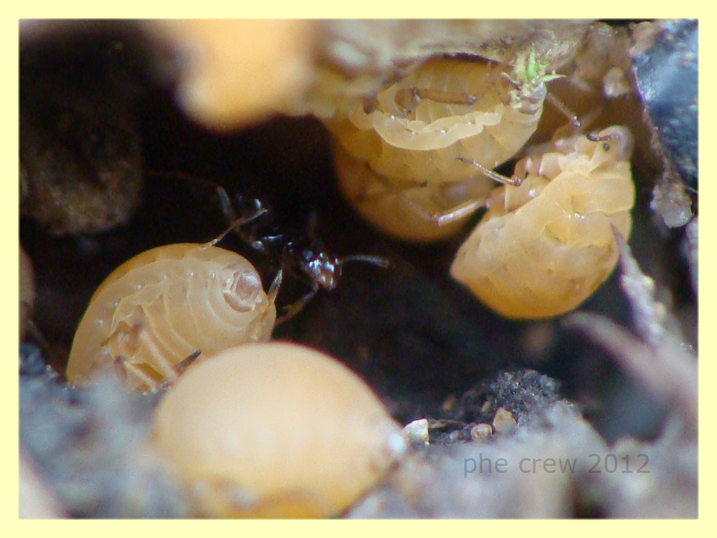 un altro gruppo di Afidi in un formicaio, a quanto pare, usati proprio come dispensa ! me ne sono accorto perchè dopo che ho scoperchiato il legno che faceva da tetto al formicaio, le formiche li hanno portati via in fretta e furia insieme alle loro uova e pupe. la foto è stata scattata ad Anzio (RM) il 7.IX.2012.