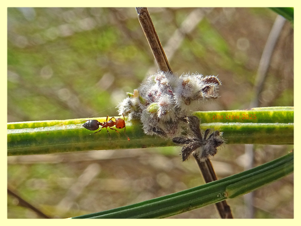 ....poi mi ha colpito che si trovavano solo su galle di Aceria genistae, in prossimita' dell' attaccatura o sulla galla stessa ma solo le ninfe appena nate piccole e giallognole. Tant' e' che le galle sembrano create dalle punture dei Planococcus sp., ma ovviamente non e' cosi'......probabilmente preferiscono le galle perche' piu' carnose e succose. Sulla Genista sp. (cosi' pare la specie) ne sulle foglie ne sui rami non ce ne sono di Planococcus sp., ma ripeto, solo sulle galle e in loro prossimita'.