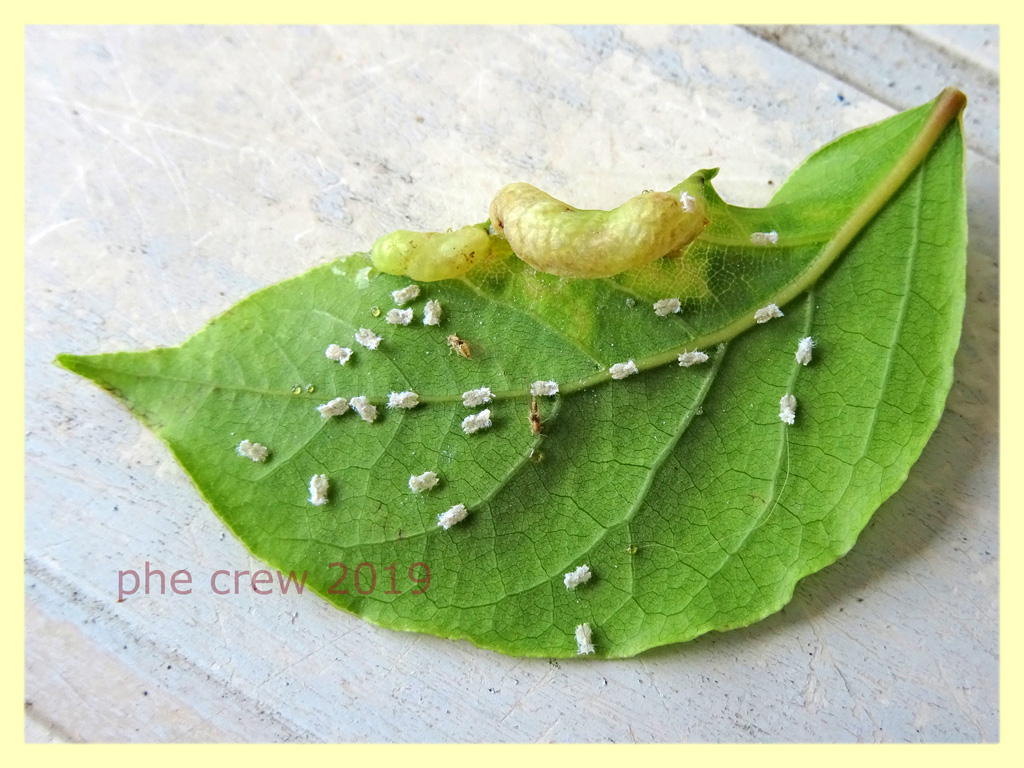 ….io penso si tratti di Trioza alacris….il corpo misura 1,5 mm. e la pianta ospite e' un Alloro. Quelle bianche sono le esuvie delle ninfe….ma non ho trovato ninfe. :hi: