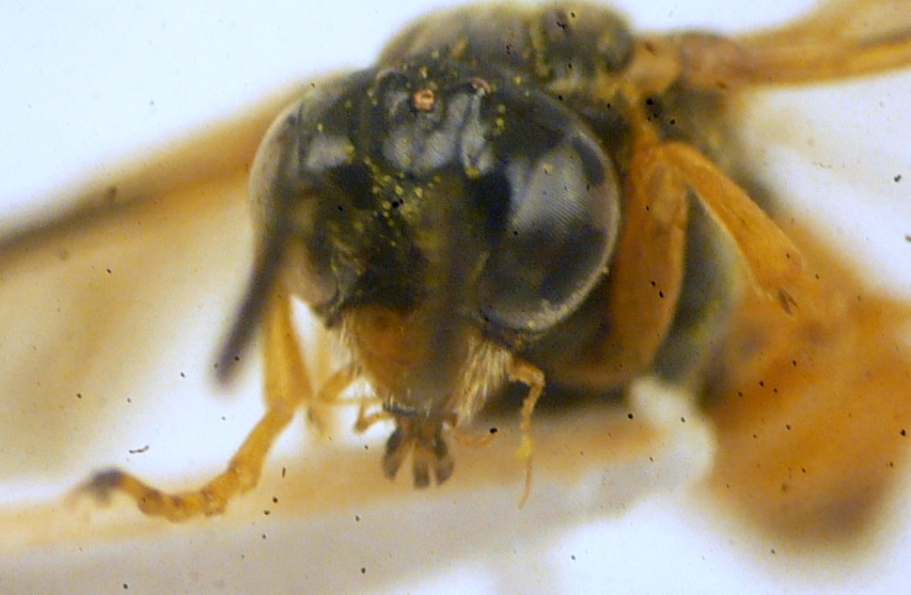 - The center of the apical edge of clypeus (but the photo is fuzzy) seems projected ahead : characteristic of bicolor.