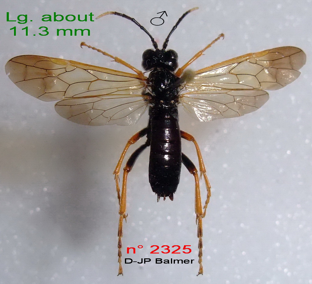 The abdomen is dorsally entirely black, and the antennae are black, except the last white segments, it thus acts of Tenthredella.