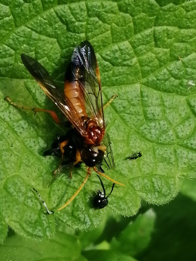 Tenthredo? Credo che stesse "preparando" la scorta alimentare per il trasporto... si vedono la testa e le ali staccate ma non sono riuscita a vedere di che preda si trattasse