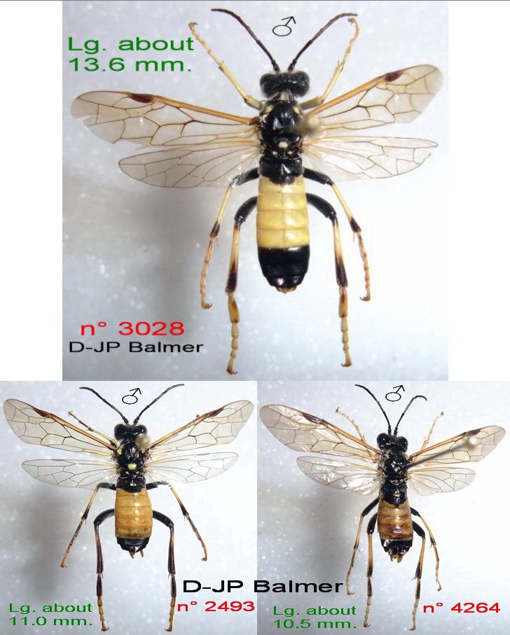 - diana ♂ : Tibiae not infuscate apically (our capture has the tibiae infuscate) - semseyi ♂ : Thorax entirely black except for narrow outer edge of tegula (our capture has scutellum, tegula and hind edge of pronotum marked with yellow) Thus we captured : maculata. According Lacourt p.263 , the var. of maculata are : - atricollaris Enslin 1912 , According Enslin p.46 : " ... Pronotum, tegulae,und Metapleuren schwarz" " ... Trochanteren oft gelb gezeichnet" - c ollaris Zirngiebl 1940 According Blank p.215 : "... was described due to the almost black pronotum and the yellow tegulae" - wagneri Zirngiebl 1940 According Blank p.216 : " ... was described due to the yellow pronotum and the almost black scutellum" --- maculata maculata ♂ has amongst other things : In all the literature that I could consult and on all (rare !) photos which I could see on the Net : - None (...) ♂ has a marginal hindwings with vein. According Enslin p.45-45 - Coxae 3 (in particular) with yellow. - Metapleuron (thing understoud) not black. According Benson fig. 29 p.191 (there is an unfortunate inversion in the key p.174) : - The two 1st tarsomere of tarsus 3 are not swollen. --- It is thus seen that our Symphyta does not have these characters. I consider that these differences, with maculata maculata and its indexed varieties, justified a placement in subspecies rather than in new variety. I named this sub-species " danieleae" in homage to my wife danièle, who worked (and still works) long hours to prepare our captures. --- Below the photos of the distinctive characters between maculata maculata ♂ (# 2493-4264) and maculata ssp. n. ♂ (#3028-3029) # 2493 captured at an altitude of about 895 m in Cne : Le-Petit-Abergement (Dépt. Ain - France) - 11.06.1992 # 4264 captured at an altitude of about 720 m in Cne : Longeville (Dépt. Doubs - France) - 27.04.2007 # 3028 & 3029 captured, at the same time, at an altitude of about 740 m in Cne : Songieu (Dépt. Ain - France) - 14.06.1995 Saluti. D & JP Balmer