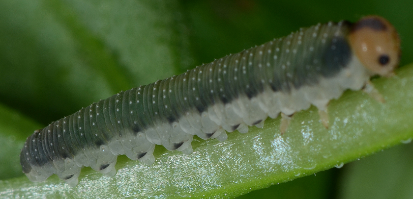 Questa piccola larva l'ho trovata in un giardino cittadino, sull'erba di un'aiola sotto una pianta di rosa. Sulla rosa non ho trovato altri esemplari, ma è possibile che sia caduto da li. Un Argidae mi sembra sicuro, genere Arge probabile, come specie non ho idea. Qualcuno può essere più preciso? |