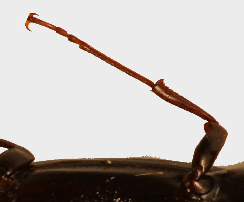 Notevoli la lunghezza del pronoto, il capo quadrato, il lunghissimo primo articolo dei tarsi di tutte le zampe in contrasto con femori e tibie cortissimi: