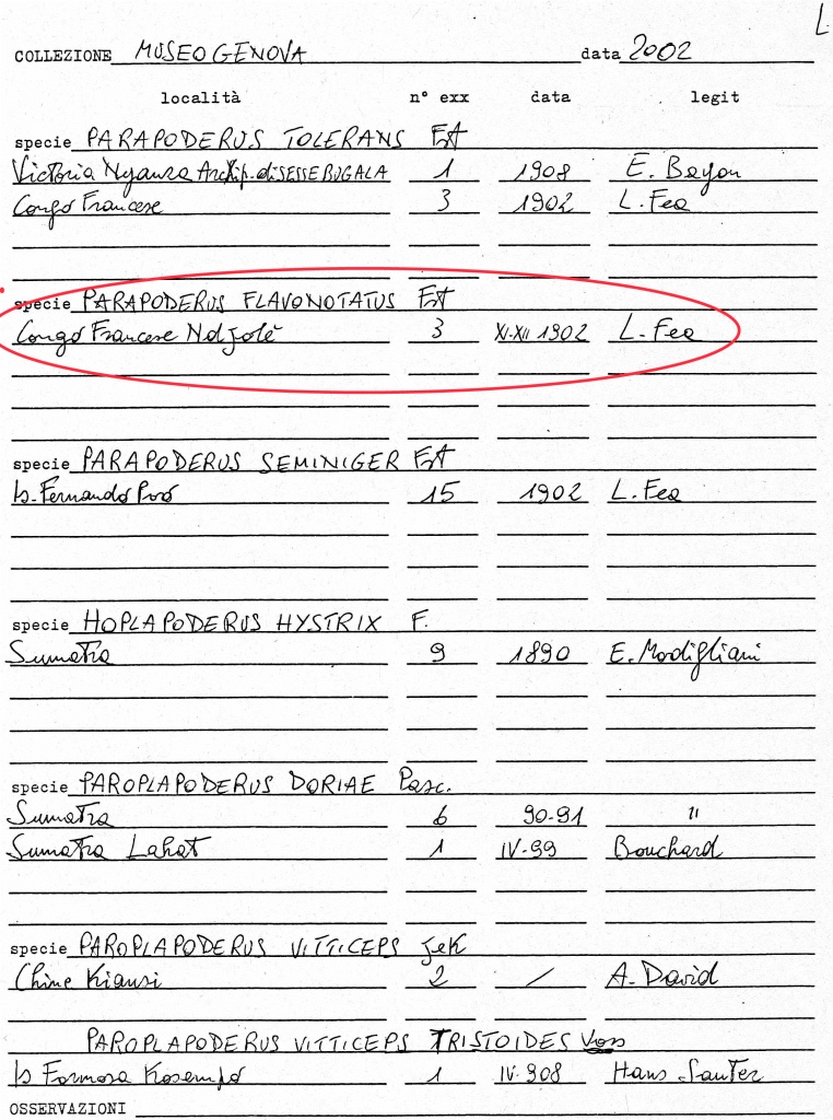 La località di raccolta si evince dal cartellino: "Congo Francese - Ndjolè - XI/XII 1902 L. Fea". Ovviamente il Congo francese è l'odierno Gabon.
