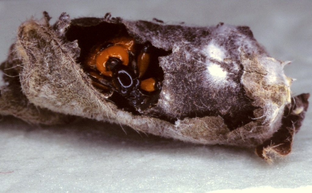 Siamo alla fine del ciclo. All'interno del suo riparo, si sviluppa l'adulto, che fora quello che resta del barilotto ed esce all'aperto. Quello che vedete nella foto è di allevamento, quindi il rotolo non è più attaccato alla pianta. In una stagione possono susseguirsi più cicli riproduttivi, nelle mie zone due o tre. La cosa è ancora controversa e non ben documentata. Ovviamente nelle prossime settimane, in cui si realizzeranno gli eventi che avete visto, mi aspetto numerosissime segnalazioni per incrementare le informazioni su questa splendida specie.