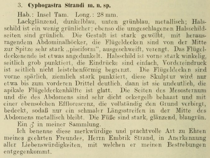 Cyphogastra sp.Questo è probabilmente l'esemplare che più mi ha fatto scervellare, tempo fa. lunghezza: 30 mm I dati di raccolta riportati sul cartellino (ripresi da quelli scritti sulla bustina) sono: China, Hainan, 18.VIII.1989, Z. L. Peng legit Il problema è che il genere Cyphogastra non dovrebbe arrivare fino lì! La specie più prossima, geograficamente, è Cyphogastra strandi, Obenberger, 1922, descritta dell'isola di Tam, prossima alla costa del Vietnam. Non è poi così lontana da Hainan. Di Cyphogastra strandi ho solo la breve descrizione in tedesco, che non mi consente di capire le caratteristiche della specie: Anni fa, seguendo le chiavi di Kerremans (precedenti il lavoro di Obenberger) ero arrivato a Cyphogastra timoriensis (Laporte & Gory, 1835), ora sinonimo di Cyphogastra semipurpurea semipurpurea (Laporte & Gory, 1835), ma questa specie ha una distribuzione completamente diversa. A rendere la cosa ancora più problematica, in collezione ho anche un altro Buprestidae misterioso indicato di Cina, che potrebbe provenire dalla stessa persona, ma non ricordo (e non c'è scritto): una Iridotaenia praticamente identica ad una specie filippina. Per cui, o c'è stato un errore nella cartellinatura, cosa che mi sembra più plausibile, o effettivamente qualcosa arriva fino a quella zona della Cina.