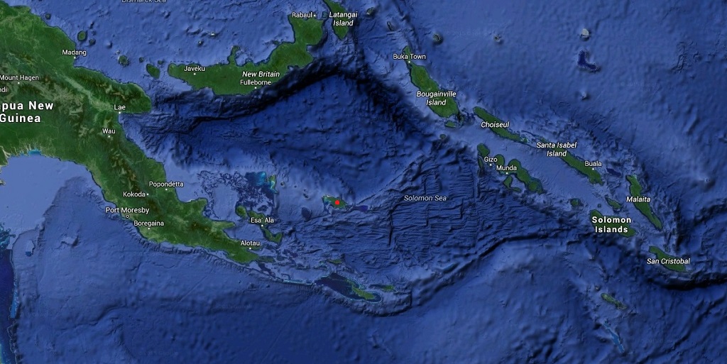 Inserisco una mappa della zona con anche i rilievi dei fondali marini, giusto per dare un'idea della zona di cui stiamo parlando. L'isola di Woodlark è quella segnata in rosso; in realtà c'è una sottilissima cresta sottomarina che quasi la collega con l'isola di Bouganville e che, in epoche glaciali, potrebbe essere emersa, anche solo parzialmente. Anche il fondo marino che la separa dalla più vicina costa della Nuova Guinea potrebbe aver subito delle variazioni di profondità, oppure l'isola potrebbe essere stata più vicina alla costa (qualche milione di anni fa la Calabria e la Sardegna erano unite alla Liguria  ). Il problema per stabilire eventuali affinità tra le popolazioni di queste isole è che bisognerebbe riuscire a reperire più materiale (sia come numero di specie che di esemplari) di quello attualmente disponibile. Mi capita lo stesso con le Batocera delle Isole Salomone, ho dati certi solo di quattro delle isole più grandi; Bouganville, Malaita, Guadalcanal e Makira ma è praticamente impossibile ottenere esemplari dalle altre isole, anche da quelle grandi come Isabel, Choiseul e Western.
