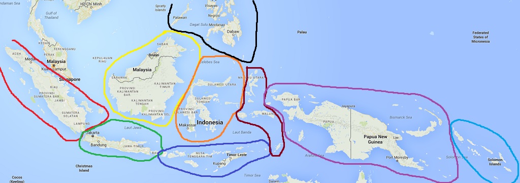 Ad essere pignoli dovremmo dividere l'area in base alle isole principali; Sumatra, Giava, il Borneo (che tra l'altro è diviso tra tre stati diversi), e Celebes, poi le isole della Sonda (quelle ad est di Giava ed a sud di Celebes), le Molucche e la Nuova Guinea (esclusa Bouganville che rientra nelle isole Salomone).