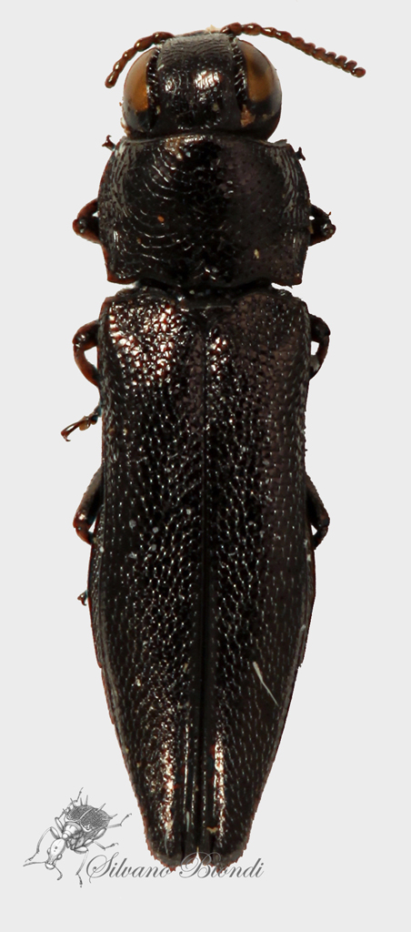 Credo che l'aspetto, a prima vista, venga un po' falsato dalla posizione. Quando è stato incollato era probabilmente un po' gonfio di liquido, per cui il protorace è un po' avanzato (l'apofisi prosternale si vede che è fuori del suo alloggiamento, nella foto laterale) ed in posizione anomala, ed anche la testa è un po' più estroflessa.