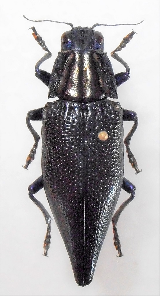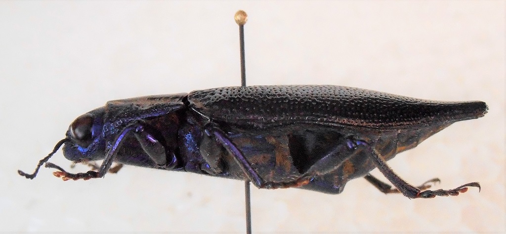 Raccolta dai locali durante la mia permanenza nel villaggio. Lunghezza 33,85 mm inserisco una seconda foto fatta con una luce leggermente diversa, sembrano due esemplari distinti, ma è sempre lo stesso... Le elitre sono completamente nere, il pronoto ha dei riflessi bronzati mentre il capo, le zampe e la parte ventranle sono di un bel blu cobalto, tranne gli ultimi segmenti addominali che sfumano al nero.