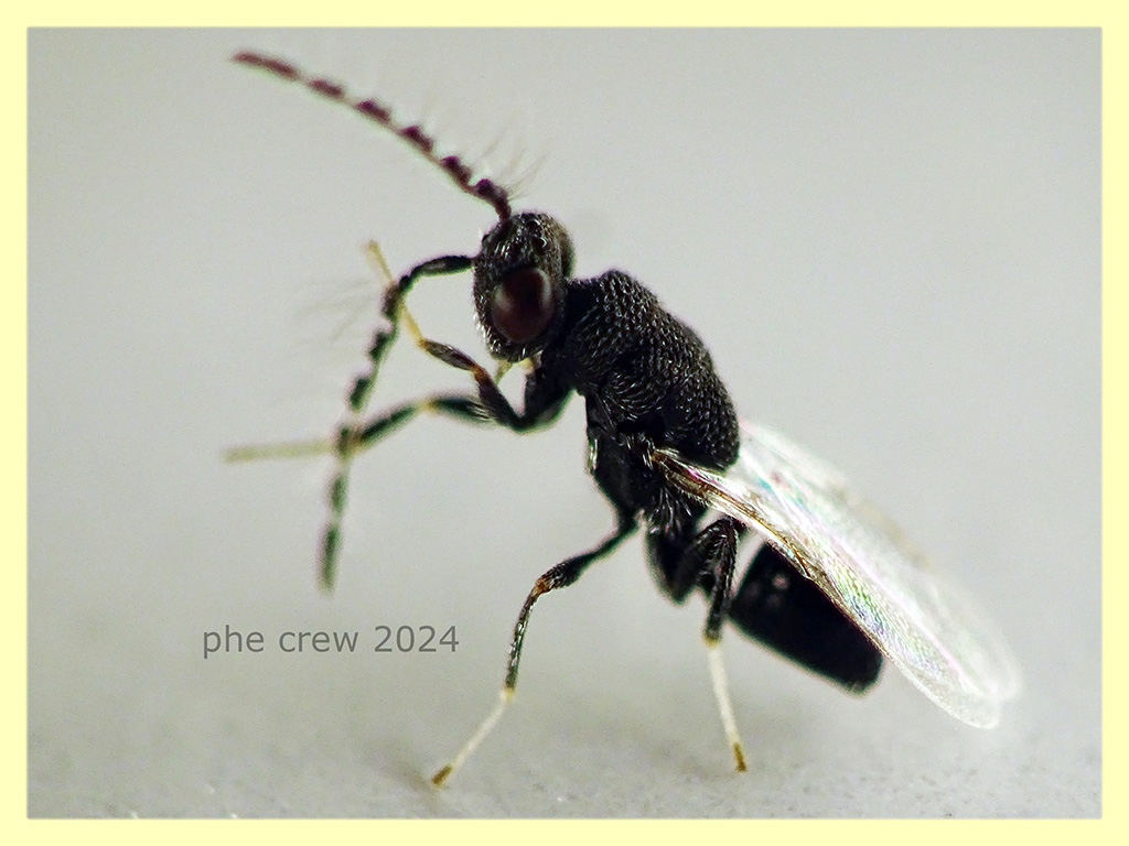....la prima cosa che balza all' occhio di questo esemplare sono i tarsi medi e posteriori bianchi e i peli delle antenne molto lunghi, avrei pensato che forse in esemplari vecchi le antenne si consumassero e il colore delle zampe sia variabile, ma poi scorrendo le foto del link che postero', mi sembra che nell' Eurytoma sp. rimasta indeterminata della vicina Francia, ed unico esemplare trovato in rete con peli delle antenne lunghi come nel mio i tarsi siano (guardacaso) bianchi. Dunque gia da questi due dettagli escluderei sia E. rosae che E. brunniventris.