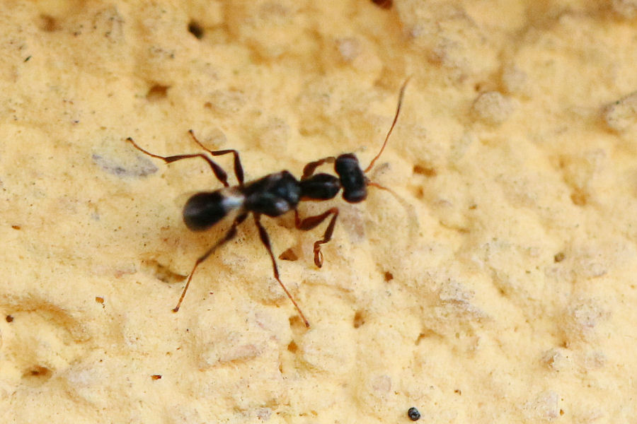 L'estate scorsa ho notato questo piccolo imenottero che si aggirava lungo il muro del nostro terrazzo. Vi chiedo scusa per la qualità delle foto - la bestiola era in continuo movimento.