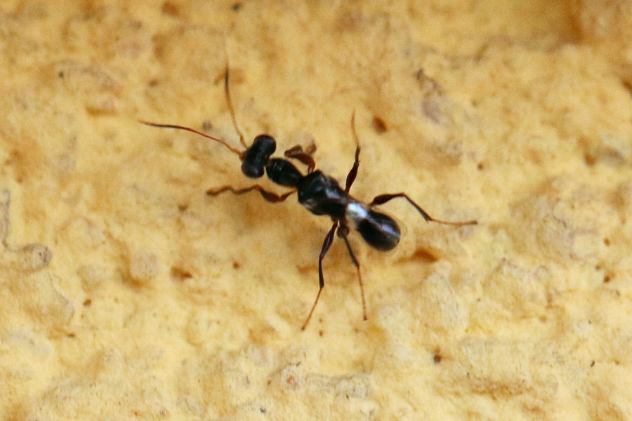 Suppongo si tratti di un Chalcidoidea, ma non ho trovato esempi con questa strana conformazione dei tarsi anteriori. Sembrerebbe che il tarso termini con una lunga spina (mi fa pensare un po' a una zampa raptatoria).