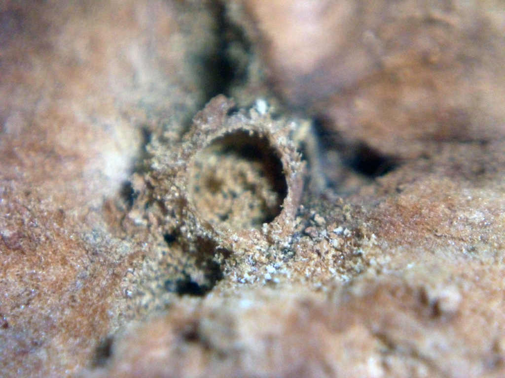 Avevo iniziato ad essere un po' preoccupato ma noto una cosa: da una spaccatura dell'altra metà vedo uscire della segatura, guardo dentro e c'è il Cynipide adulto che sta scavando la galleria per uscire dalla galla :hp: Ho fatto anche alcune foto del Cynipide dentro alla spaccatura, ma sono venute tutte sfocatissime :oooner: