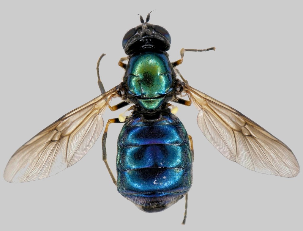 Ali chiare, tarsi neri, peluria facciale poco rappresentata (assenza di peli folti e neri) -> femmina di Chloromyia formosa.