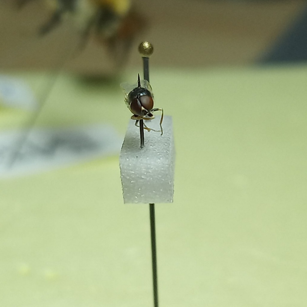 Penso si tratti di un maschio di Nemotelus notatus Zetterstedt, 1842 - Stratiomyidae. Visto che l'insetto è spillato e non può scappare, si meriterebbe foto un po' più dettagliate (nervatura alare, particolari del capo e delle zampe).