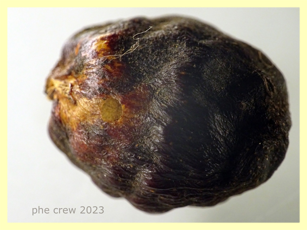 , e uno di questi presentava un foro da sfarfallamento....ovviamente c' era anche l' ospite morto da chissa' quanti anni. Girando nel forum e nel web sono arrivato a conclusione di essere davanti ad una femmina di