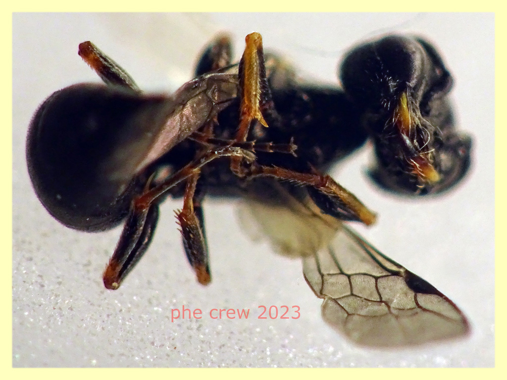 ...questo e' caduto nel piattino giallo, a me sembra Diodontus minutus femmina. Le femmine, da quanto ho letto, misurano dai 5 ai 6 mm...questo cosi' com'e' un po accartocciato misura 4 mm., ma se si stende arriva benissimo sui 5-6 mm. Le femmine di questa specie sembrano avere antenne nere anche inferiormente (i maschi gialle inferiormente), le tacche sulle tibie molto piu' accentuate dei maschi e le parti chiare, sempre delle zampe, aranciate anziche' gialle come nei maschi. In conclusione...sara' lei ??