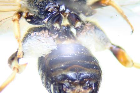è un maschio lungo circa 8 mm. Le zampe posteriori mi sembrano particolari, per uno strano prolungamento delle tibie e perchè i femori portano delle spazzole di grossi peli, se di peli si tratta, piene di acari.