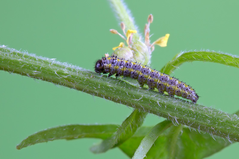 Ciao, ho trovato questo bruco il 01 Giugno 2013 su Sisymbrium officinale. L'ho portato a casa per allevarlo e dopo un paio di mute purtroppo oggi è morto senza alcun motivo visibile, quando era giunto a circa 2 cm di lunghezza.
