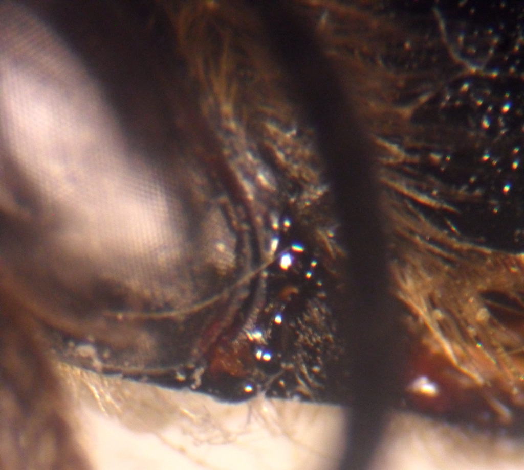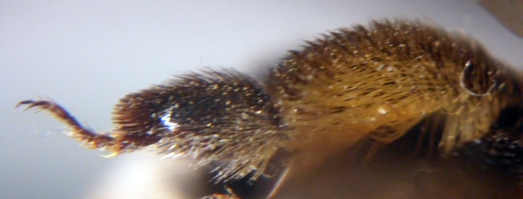 Questo รจ uno dei circa 20 Apoidei che ho raccolto un paio di settimane fa durante una breve caccia alla Valle dell'Arcionello. La venatura alare e lo spazio malare brevissimo, quasi assente, mi fanno pensare ad una Anthophora ma non sono affatto sicuro. 17mm Spazio malare Tarso mediano Zampa posteriore |