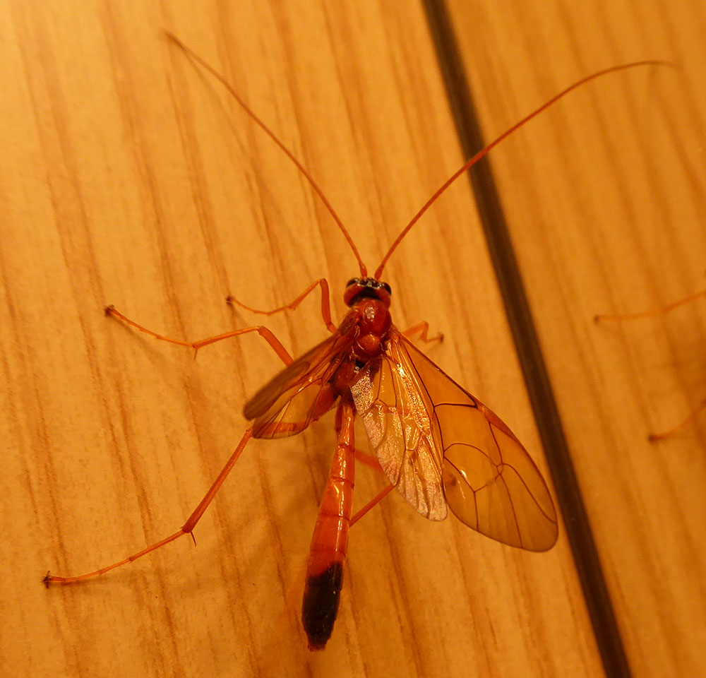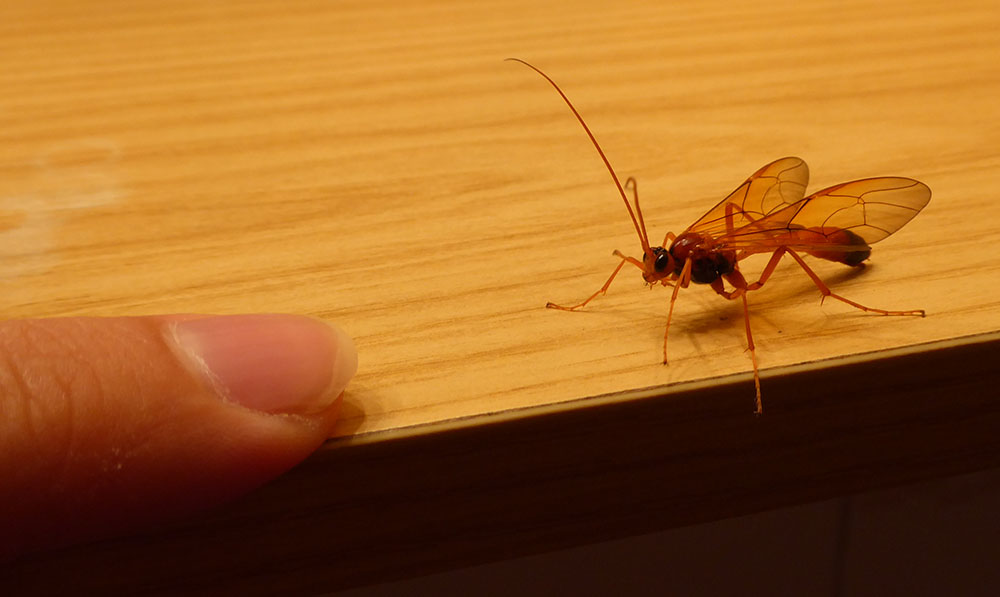 A me ricorda in qualche modo un icneumonide, però non so. Ho parecchie foto, quindi se serve posso caricarne altre (allego anche foto col dito per le dimensioni).