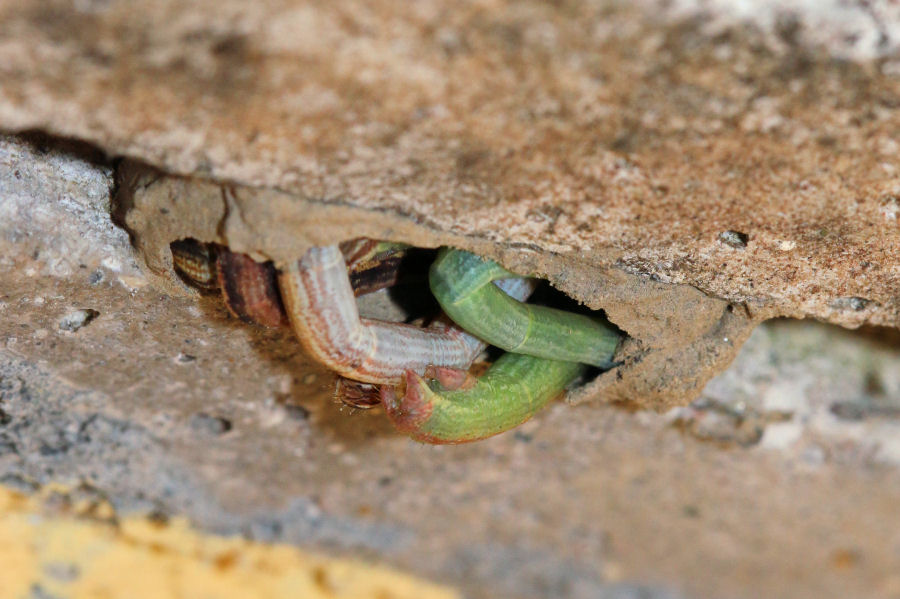 Ciao a tutti, vi chiedo aiuto per identificare un Eumenide osservato sul terrazzo. In realtà avevo visto, nascosto nella canalina sottostante la copertura in cemento del bordo del terrazzo, una forma dello stesso colore del cemento e lunga circa un centimetro e mezzo. Tastandola si è rotta la parete esterna e sono apparsi diversi piccoli bruchetti, tutti aggrovigliati e vivi. Dispiaciuta di aver rotto un qualche nido, l'ho richiuso con uno strato di terra argillosa. Dopo pochi minuti ho notato una vespa che, disorientata, svolazzava attorno a quel nido. Era evidente che il nido doveva essere suo. Non l'avevo mai notata prima e pure doveva averci lavorato da un po'. Non avevo visto delle aperture in quella strana struttura, suppongo quindi che ormai la vespa stava solo rafforzando la chiusura. E' volata via per tornare ancora una volta, poi non l'ho più vista. Ecco l'unica foto all'incirca decente che sono riuscita a scattarle. Questo invece è il nido spezzato |