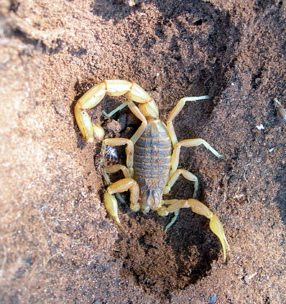 Per una mia sbadataggine uno scorpione come questo stava per pungermi: per fortuna non è riuscito a bucarmi il palmo della mano.