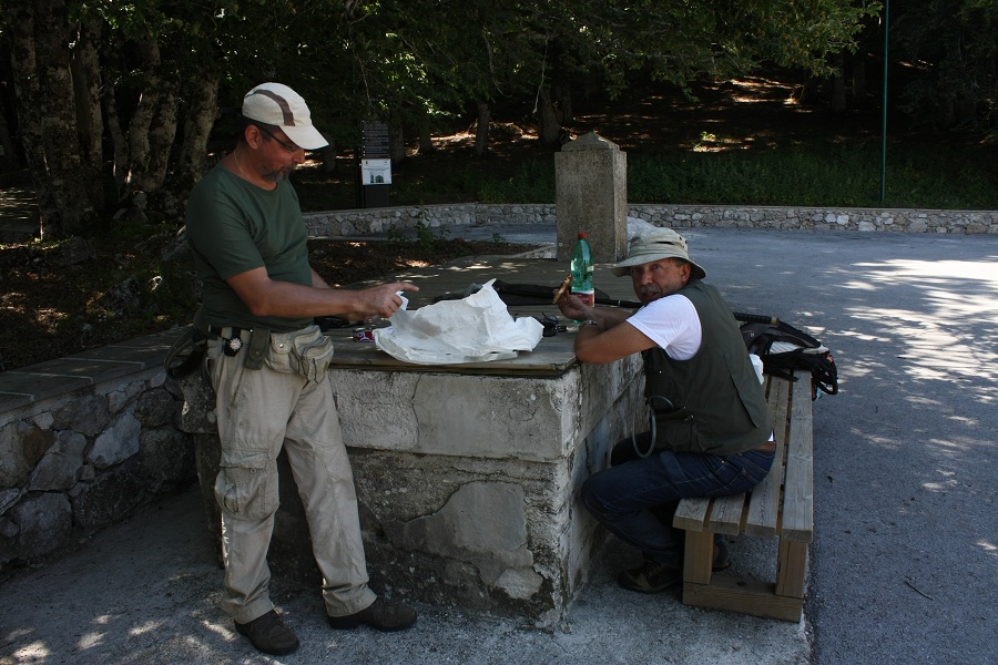 Ieri finalmente ho raggiunti il trio per una splendida caccia in giro per l'appennino lucano!! Devo premettere che ieri è stata la mia prima uscita entomologica in compagnia di entomologi di un certo spessore, quindi potete immagina re la gioia fanciullesca che ho provato!!! Complice la felicità di conoscere amici fantastici, il fatto che c'era poca roba e la mancanza di un buon retino (avevo solo l'aspiratore) ho badato poco alla caccia ma mi sono concentrato nel carpire più notizie possibili sui metodi di cattura, preparazione ecc.........nonostante il buon Franco facesse di tutto per nascondere i suoi segreti!!!  In reltà per un attimo mi ha consentito di vedere il sacro retino con il quale catturerebbe anche un cinghiale!!! La giornata è stata incentrata soprattutto sui crisidi e crisomelidi, senza disprezzare altro ovviamente! Siamo stati prima all'abetina di Laurenzana e poi ci siamo spostati nei dintorni, della prima parte non ho foto  anche perchè ero molto preso nell'assimilare i tanti consigli che mi venivano dati! Dopo aver mangiato ho deciso che qualche ricordo di questa spledida giornata ci doveva essere!!  Ecco qui Gian Luca e Maurizio mentre sgranocchiano la focaccia di Matera che ho portato per ringraziarli (e ingraziarmeli per future caccie!!!  ) Piccolo brivido: l'auto di Gian Luca (quella che si intravede sulla sinistra) ad un certo punto inspiegabilmente si è iniziata a muovere con il freno a mano tirato e stava prendendo una bella discesa, solo uno scatto fulmineo di Franco con l'aiuto di Maurizio e il mio siamo riusciti a fermarla!! Gian Luca ieri catturava proprio di tutto!!  Continua.............