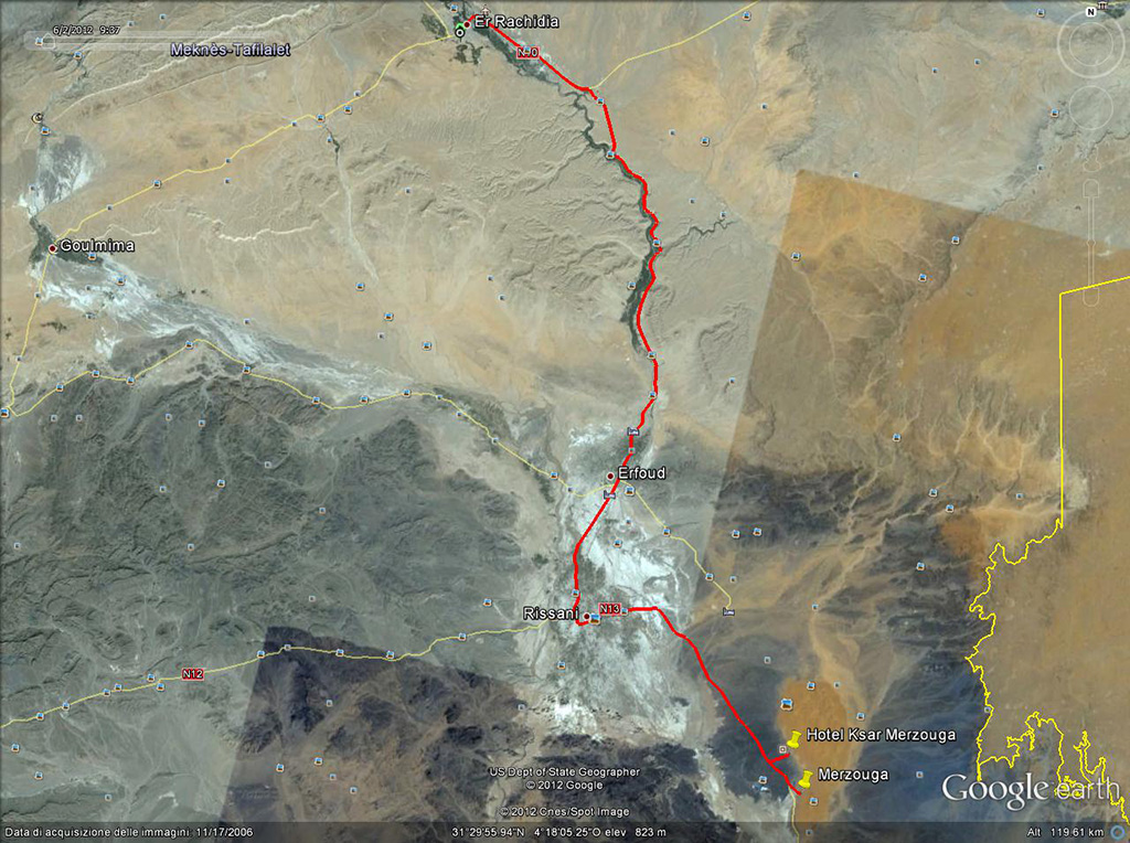 A Erfoud mi fermo a comprare acqua e pane ed un berbero mi chiede se voglio visitare le zone della città dove sono stati girati i film Marrakesh Express, il Thè nel deserto, ed altri, ma declino riferendo (mentendo) che sarei tornato l’indomani. A sud di Erfoud mi fermo a cercare e trovo pochi insetti. Riparto, raggiungo Rissani e, infine, arrivo a Merzouga.