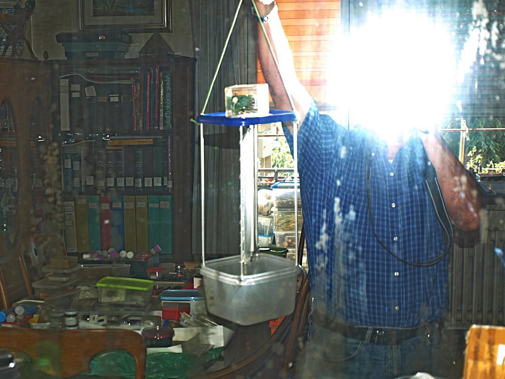 This is my old home-made light trap. I built it several years ago, to put it hanging from tree branches. I used a plastic box (white with a blue cover), 4 small tubes in aluminium, a transparent plastic sheet (recovered from the package of a shirt), a small plastic box (it contained a heart valve) with an electronic circuit recovered from a portable lamp e 4 1,5V batteries inside (batteries not in this photo). And a neon tube (I have two for this lamp, one white, this one, and another UV - Black Light). And this is to show the size