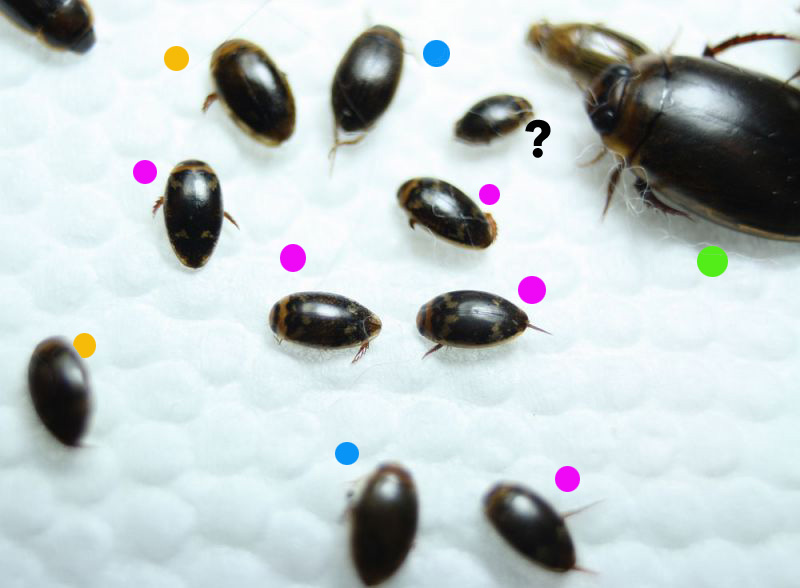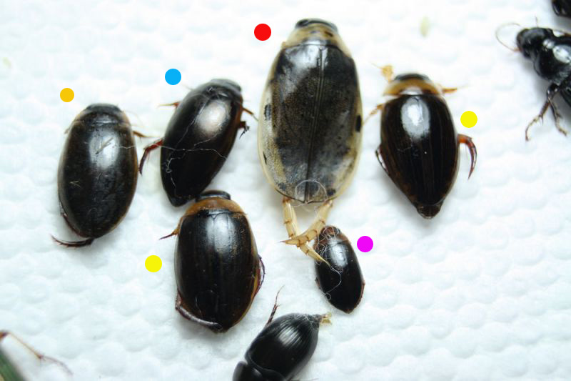Dear Georgi, I think I could identify all, the second photo is less accurate for me, at least for 2 species: Red circle: Eretes griseus - very rare and interesting species; Orange: Rhantus suturalis; Yellow: Hydaticus grammicus; Blue: Ilybius, possible fuliginosus; Purple:= Hygrotus (Coelambus) impressopunctatus (not very sure). It is very strange for me how to be together Eretes sticticus (a species that prefer temporary pounds in sandy areas) with Ilybius fuliginosus (a mountaignous species)  Orange: Laccophilus hyalinus or L. minutus; Purple: Laccophilus variegatus; Green: Rhantus suturalis; Blue: Hygrotus (Coelambus) impressopunctatus (not very sure about the below one); ? It is possible to be Porhydrus obliquesignatus or something else I never seen.