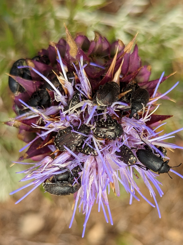 Nessuna traccia della Julodis però e quindi andiamo dalla parte opposta della strada, da dove veniva l’esemplare che abbiamo trovato. Guardando sui fiori troviamo un esemplare e poi un altro, rendendoci presto conto che queste maledette si nascondono tra le spine di questa pianta arbustiva che cresce bassa nel terreno arido. La spcie si rivelerà poi essere Julodis aequinoctialis.